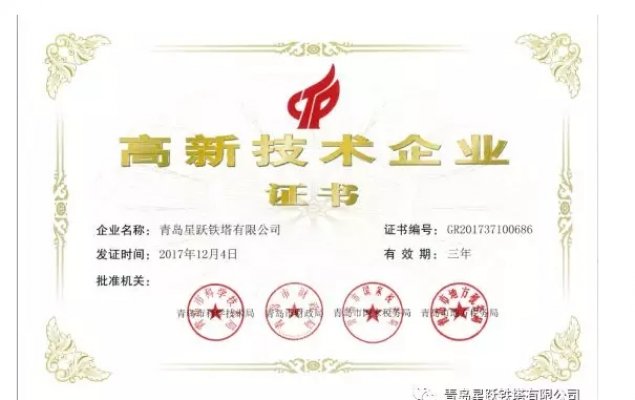 青島星躍鐵塔有限公司于近日收到由青島市科學技術局、青島市財政局、青島市國家稅務局、青島市地方稅務局聯(lián)合頒發(fā)的《高新技術企業(yè)證書》